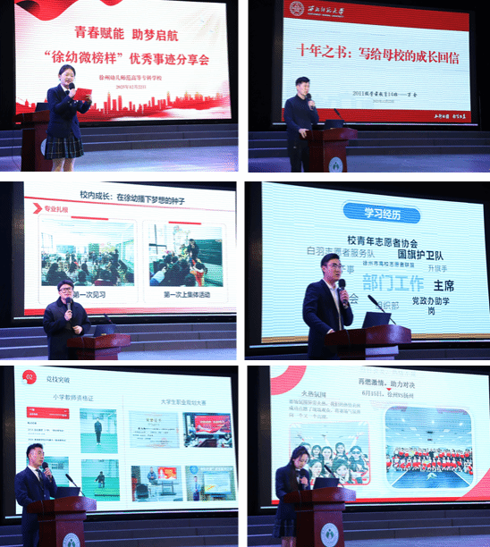 表彰大会结束后,举行了“徐幼微榜样”优秀事迹分享会。2011级优秀校友、西北师范大学博士研究生万金分享了自己从学生干部到学术研究者的进阶之路;2011级优秀校友、“陈小龙奖学金”捐资设立者、盐城市尚庄中心幼儿园园长陈小龙深情讲述了扎根乡村幼教十年、情系母校反馈桑梓的感人历程;2015级优秀校友、全国高校毕业生基层就业卓越奖学金获得者梁状动情回顾了教育援藏、坚守雪域高原的奉献岁月。国家奖学金获得者燕飞翔、苏超奖学金获得者郭美诗作为在校生优秀代表,也分别讲述了他们在专业技能与文体活动中的拼搏故事与成长感悟。五位榜样的讲述真挚动人,充分展现了徐幼学子志存高远、脚踏实地、多元发展、奉献担当的精神风貌,为在场同学上了一堂鲜活深刻的人生励志课。